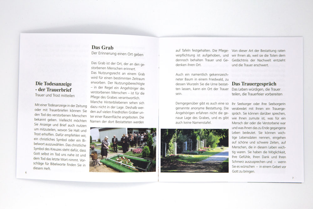 Die Broschüre bietet die wesentlichen Informationen rund um die kirchliche Beerdigung und die Zeit der Trauer. Sie eignet sich als Give-away an Tagen des Friedhofs oder Geschenk anlässlich eines Trauergesprächs.